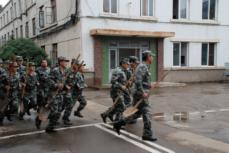 星火機床公司民兵應急營防汛抗洪連3排在公司大門口開展了防汛抗洪應急演練。公司領導、防汛領導小組成員趙錦銘、鞠家兵、劉生玉觀看了演練。