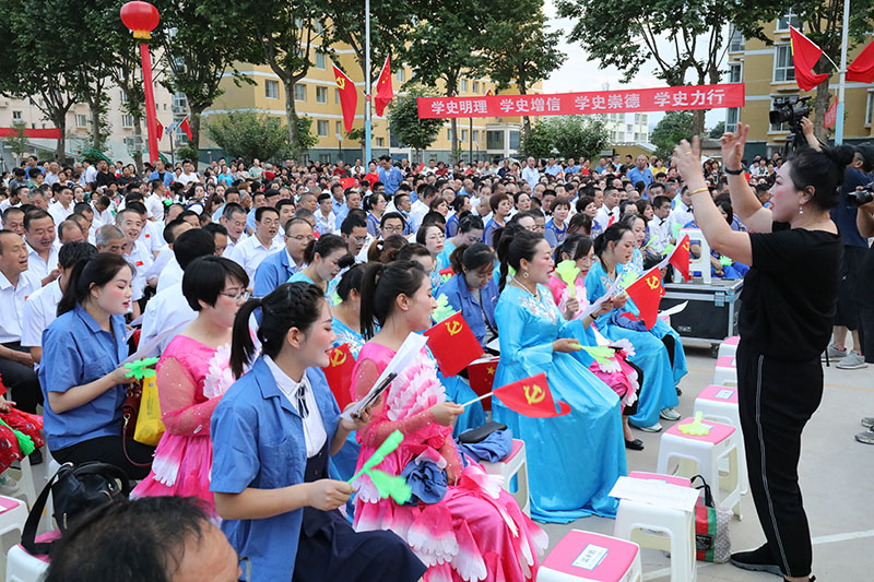 演出現(xiàn)場,一面面鮮紅的黨旗國旗隨風(fēng)飄揚,一條條宣傳標(biāo)語隨著氣球在高空飄蕩,喜慶歡快的音樂余音繞梁。一張張笑臉喜氣洋洋,歡笑聲此起彼伏,發(fā)光拍手噼啪作響,手搖黨旗國旗有節(jié)奏的擺動,“拉歌”的吶喊聲一浪高過一浪……